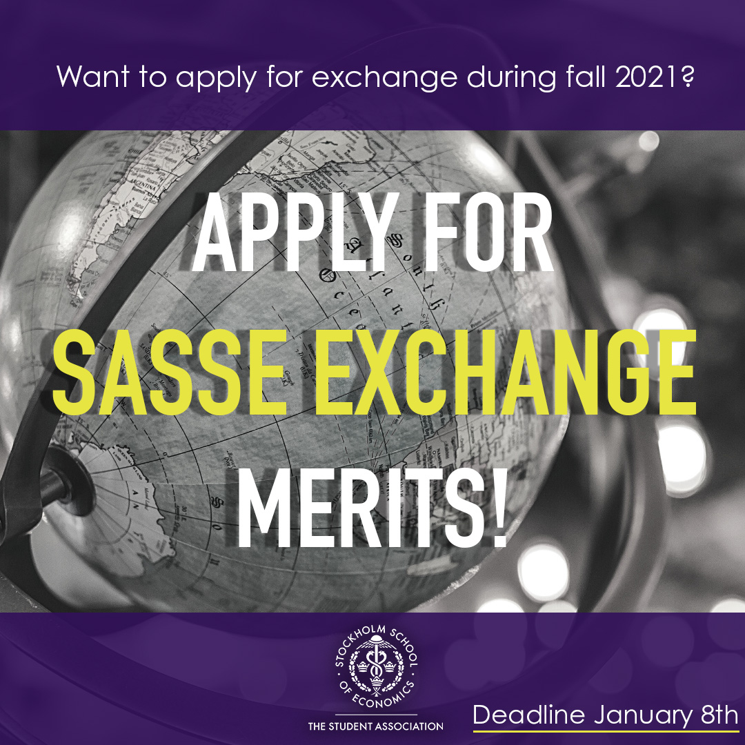 IMPORTANT INFORMATION! The deadline to apply for SASSE Exchange Merits is Friday, 08 January 2021 at 23:59. Please note that this is earlier than the deadline for applying for the BSc Student Exchange Programme Autumn 2021.