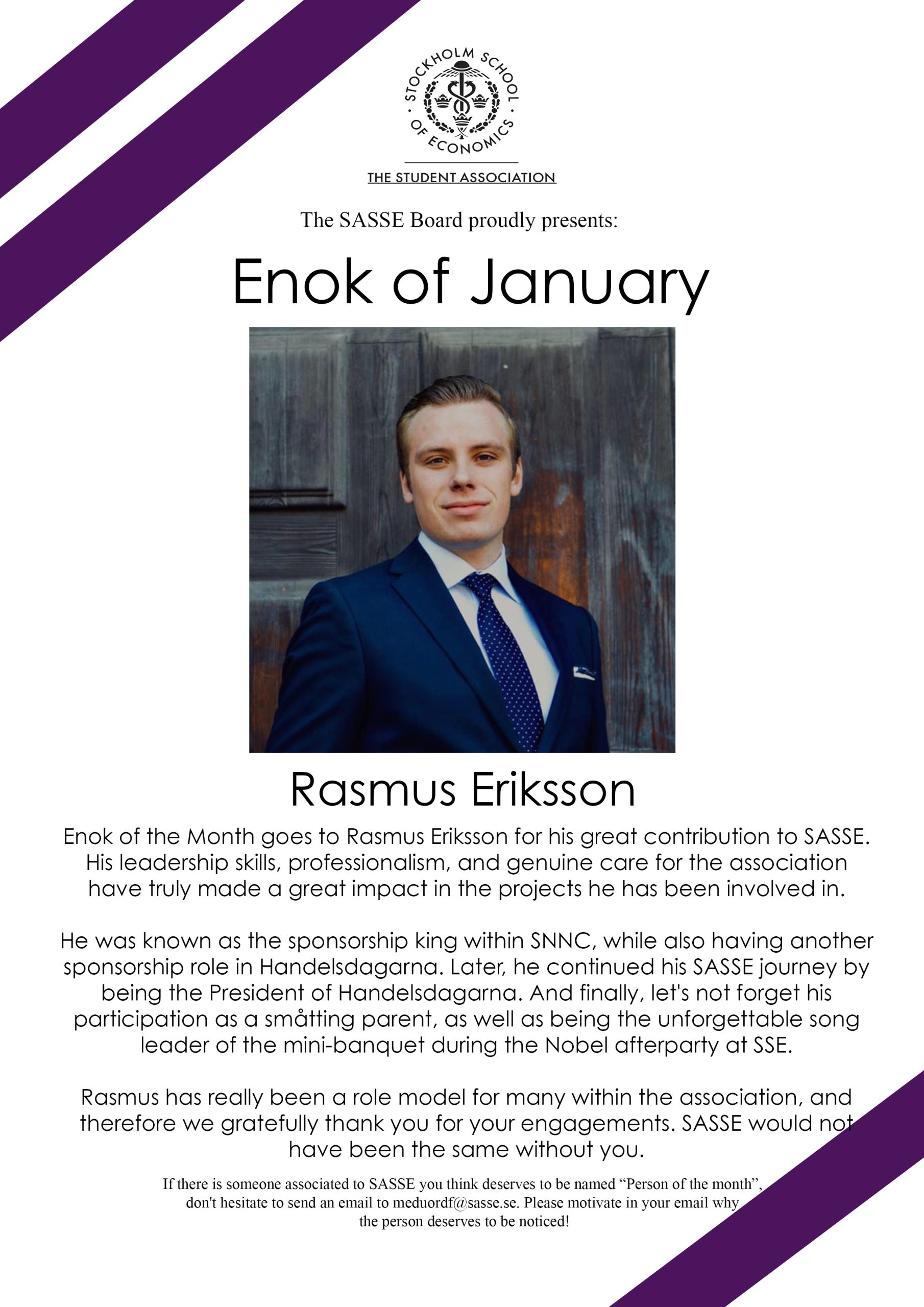 Rasmus Eriksson is Enok of the month! Congratulations, and thank you for your hard work!