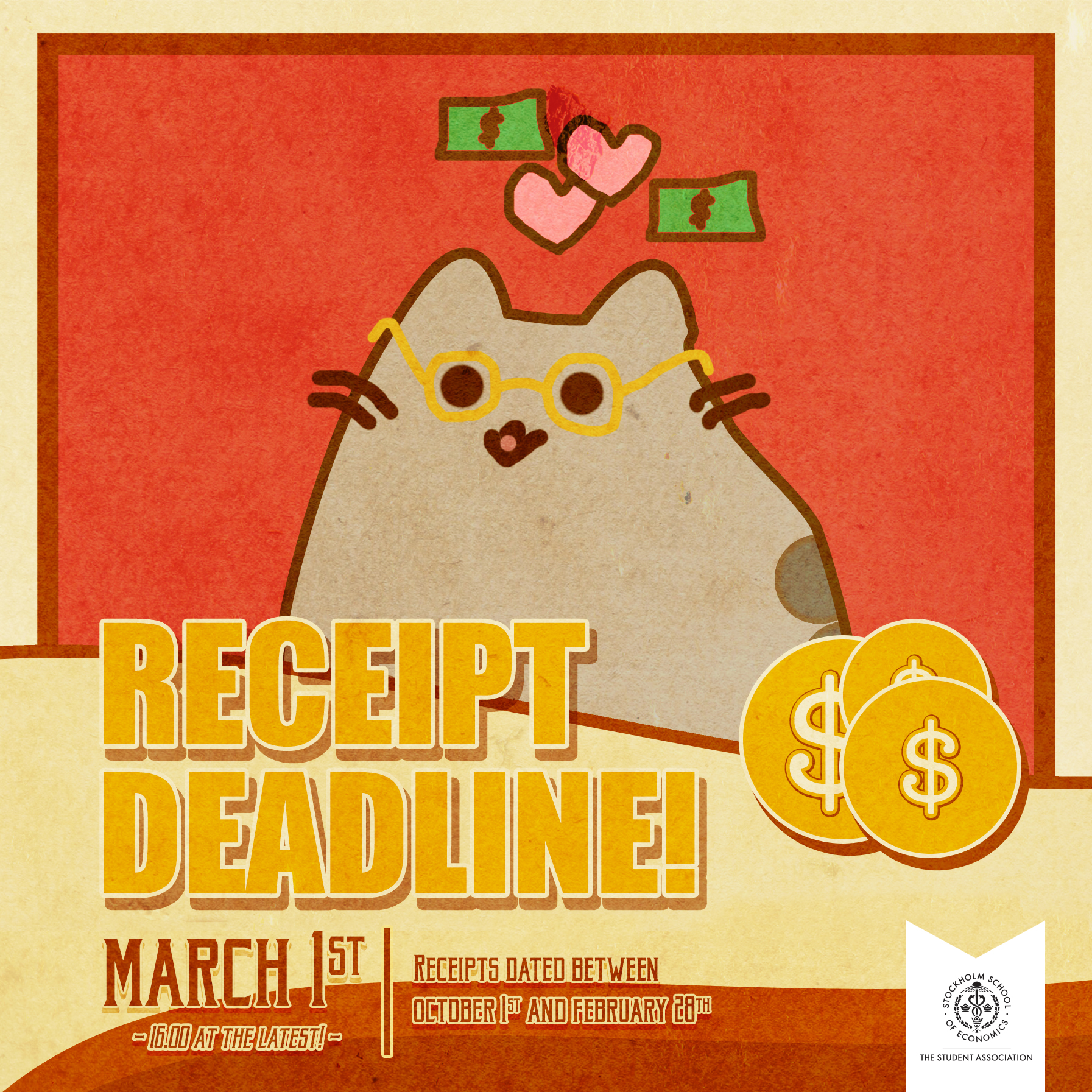 All receipts dated between October 1st and February 28th must be handed in at the SASSE reception no later than March 1st at 16:00. This is due to the annual closing of the SASSE financial year. There will be no exceptions.