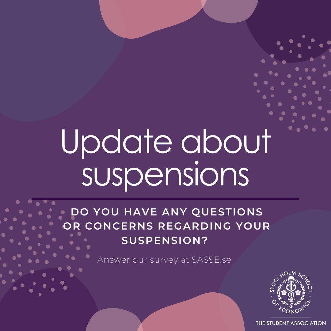 As stated previously, a student suspended based on alledged cheating is not suspended from the association. You are therefore allowed to continue with any SASSE engagment you have and your are allowed to be in the association’s premises down in the basement on Sveavägen and in the corridor on Saltmätargatan. Though, you will not be able to get access to the entrences as these are controlled by SSE as stated in our rental agreement.